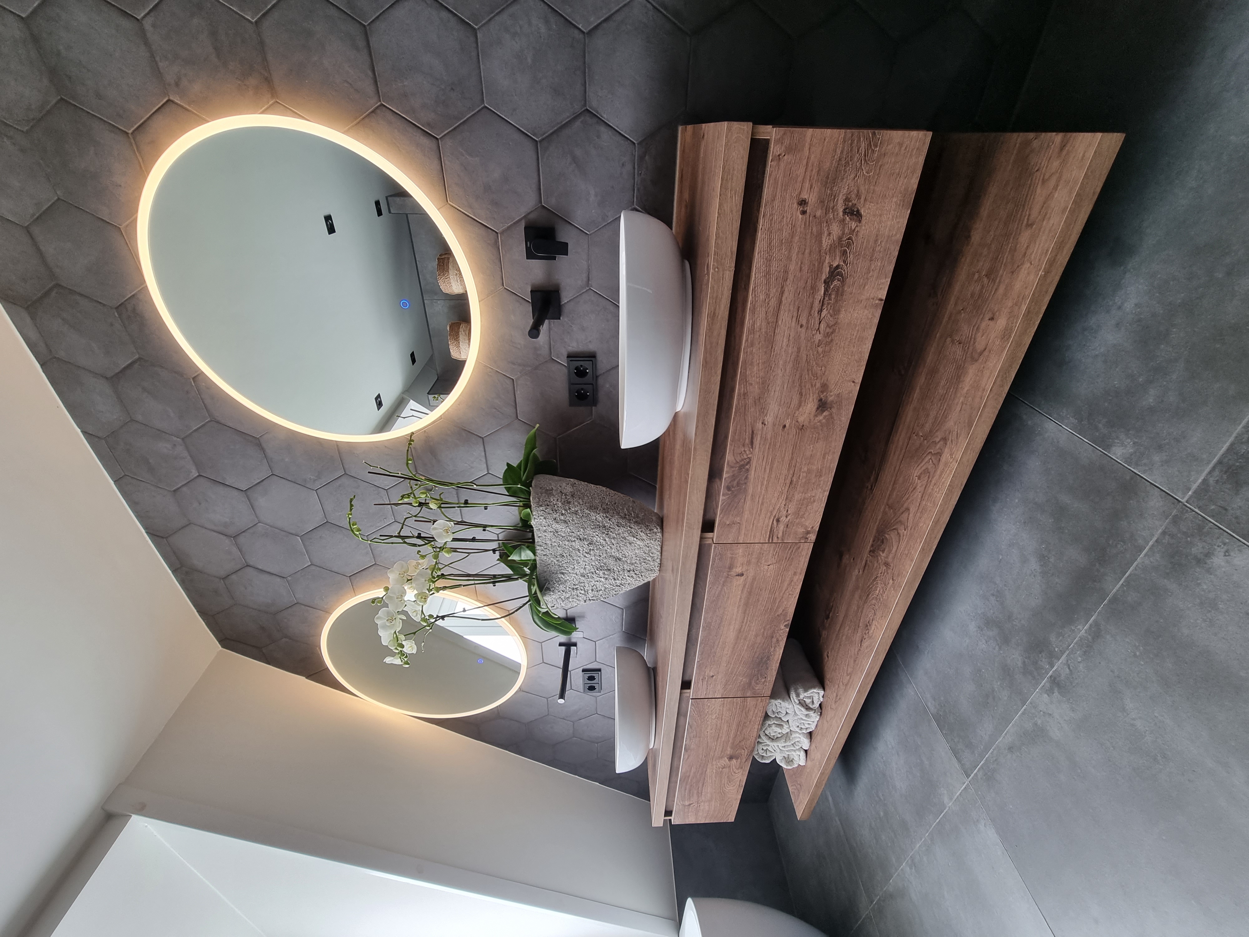 Deze badkamer in Hardenberg combineert eigentijds design met praktisch comfort. De zorgvuldig gekozen materialen en het doordachte kleurenpalet geven de ruimte een luxueuze maar toch huiselijke uitstraling.